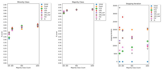 The different oracle instances described have multiple assumptions regarding the data and the GAN architecture, and thus can be used in diverse contexts. These instances serve as examples of possible oracle instances that can be used. However, the specific task requirements and the end-user preferences should drive the selection of the oracle instance to be used for a certain problem involving training a GAN. A comparison between the different oracle instances used in this paper is shown in Table 1. We observe that some oracles are only suitable for being used with CGANs (CAS-real and CAS-syn), while others can use any selected GAN. In terms of the required class labels, only FCD does not require the existence of labeled data during the training, while all the other alternatives discussed require those labels. We also verify that all oracles can be applied to imagery data, while only four of the implemented oracles are applicable to tabular data. Table 1 also displays the number of times the network/classifier in the oracle is required to train (column “train times”). The indication of “one time” means that it is trained in the beginning and no further training is necessary, and “multiple” means that a new training process is necessary after each change in the GAN weights. CAS-real is the only oracle instance that needs to have the training repeated multiple times to obtain the desired score. The remaining oracles only need to be trained once. By comparing all the six implemented oracle instances, we observe that the FCD is the most flexible, working for both tabular and image data while not requiring class labels and allowing the usage on any GAN architecture. We must also highlight that all oracle instances can be used with colored images and almost all can also be used with black-and-white images. Following some preliminary test, we observed that the oracle IS is not suitable for black-and-white images.