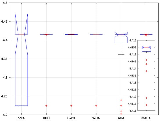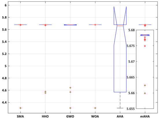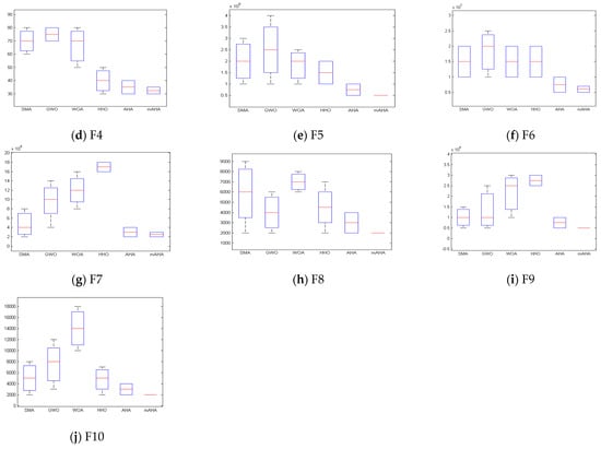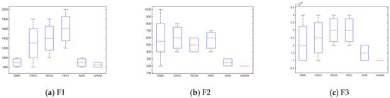 Boxplots are employed to exhibit the data distribution. The distribution reflects the local minimum of test functions. Furthermore, boxplots consider an effective presenting method for data distributions in quartiles, where the obtained maximum and minimum data points are represented by the Boxplot whisker’s edges. Furthermore, the higher the level of data agreement, the narrower the boxplot, Figure 2. Boxplot introduces the results for ten functions, Dim10. It is observed that the mAHA algorithm reaches the best results compared to the other algorithms.