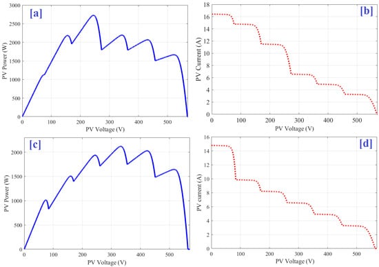 The details of shadow patterns. (a) P-V curve first scenario, (b) I-V curve first scenario, (c) P-V curve second scenario, and (d) I–V curve second scenario.