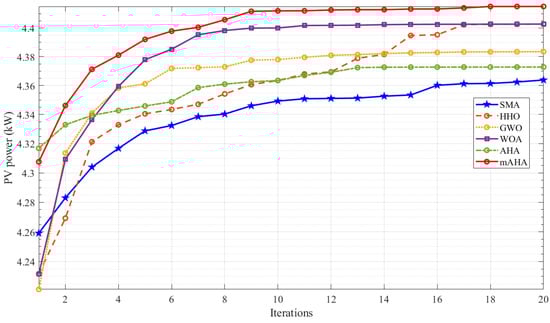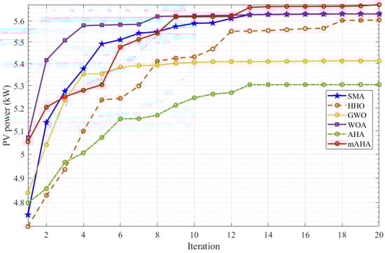 The two shadow scenarios are shown in Table 7, where the proposed mAHA has the best performance compared to other algorithms. For the first scenario, the average PV power values varied between 2716.754 W and 2067.039 W. mAHA achieves the maximum PV power of 2716.754 W, which is matched by HHO (2186.705 W). The minimum PV power of 2067.039 W is achieved by AHA. Thus, the proposed mAHA increases the PV power by 31.3% compared to the original AHA. The values of STD vary from 0.004308 to 0.516302. The minimum STD of 0.004308 is achieved by mAHA, followed by SMA (0.246108). The worst value of STD of 0.516302 is achieved by AHA. For the second shadow scenario, the average PV power values vary from 2119.219 W to 2094.641 W. mAHA achieves the maximum PV power of 2119.219 W, followed by WOA (2113.31 W). The minimum PV power of 2094.641 W is achieved by SMA. The values of STD vary from 0.000996 to 0.08421. The minimum STD of 0.000996 is achieved by mAHA, followed by HHO (0.047632). The worst value of STD of 0.08421 is obtained by SMA.