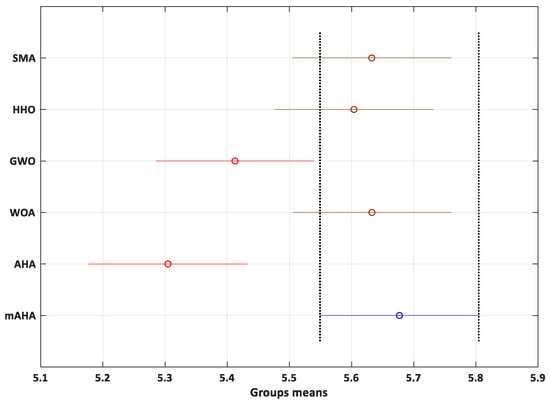 - Table 6 shows the results of the analysis of variance (ANOVA), and Figure 8 shows the corresponding ranking. As shown in Figure 8, Figure 9, Figure 10 and Figure 11, the mAHA can outperform the other commonly used methods. The mAHA has the smallest range of variance and the largest mean fitness (maximization problem), indicating its resilience and accuracy.