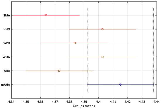 To support the ANOVA results for this case, a Tukey Honestly Significant Difference (Tukey HSD) post hoc analysis was performed. The findings are shown in Figure 11. Like the previous case, the mAHA has the greatest mean fitness. After the mAHA, the WAO and HHO provided good results.