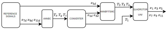 This section presents a new control method for solving the trajectory tracking problem of a quadrotor. The quadrotor control system is divided into attitude and position control systems. The underactuation problem is solved by modifying the position subsystem. The objective is to design a compound controller, ANNBC-ANNBIFTSMC, to track the desired states, , . The block diagram of the proposed strategy is demonstrated in Figure 1.