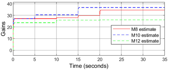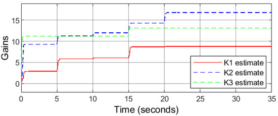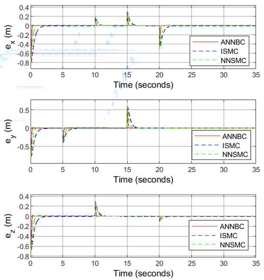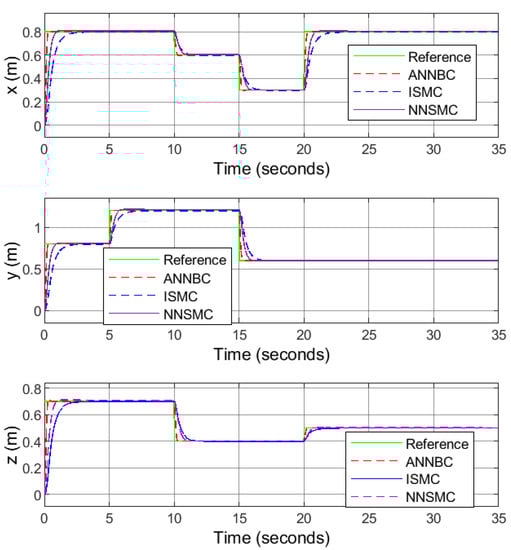 In order to validate the superior performance of the proposed hybrid ANNBC-ANNBIFTSMC, comparisons with existing hierarchical controllers developed in [23,31] are provided. In [23], integral sliding mode control (ISMC) and backstepping sliding mode control (BSMC) were developed for the position and attitude subsystems of the quadrotor, respectively. In [31], neuro-adaptive sliding mode controller (NNSMC) and robust integral of the signum error (RISE) were designed for the position and attitude subsystems of the quadrotor, respectively. The trajectory tracking results of the quadrotor position depicted in Figure 2, along with the tracking errors in Figure 3 show that the three control strategies can accomplish a stable flight in general. However, the ISMC provides the lowest tracking performances compared to both ANNBC and NNSMC. Due to the approximation property of the RBFNN to estimate the time-varying disturbances, the NNSMC shows an improved performance compared to the ISMC. The proposed ANNBC gives the most promising performance because of its ability to adjust its gains with abrupt change in the reference trajectories and to approximate and compensate the time-varying disturbances using the RBFNN. The gains of the ANNBC are presented in Figure 4.
