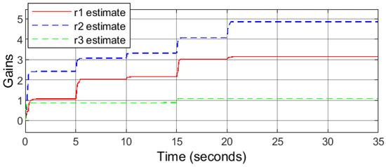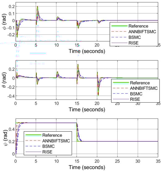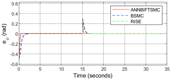 The attitude responses are shown in Figure 5. It can be observed that the proposed ANNBIFTSMC provides more accurate tracking under the parametric uncertainties, time-varying disturbances, and sudden change in reference trajectories. Although both BSMC and RISE are robust to disturbances, the ANNBIFTSMC outperformed them because it combined the advantages of an integral error term to remove the steady state errors, a nonlinear error term for fast convergence, a backstepping approach for guaranteed stability, and RBFNN for estimating disturbances. In addition, the tracking error responses of the yaw angle presented in Figure 6 further illustrate the convergence speed of the ANNBIFTSMC compared with the other controllers. The evolution of the gains of the fast terminal reaching laws are depicted in Figure 7 and Figure 8. As shown in Figure 9, the control signals are free from chattering phenomena.