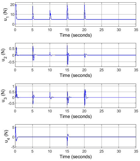 Therefore, considering Lemma 1, the closed loop signals are semi-globally finite time stable. In the same way as the altitude () control design, the control inputs for the positions and are derived as follows: