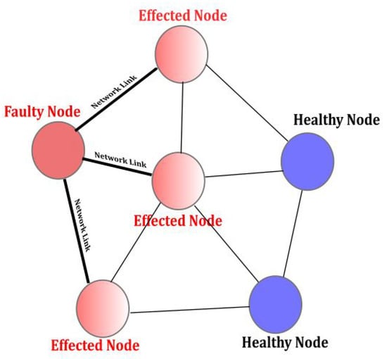 Consider a networked environment, as shown in Figure 1, where six nodes are connected in a network. There is one faulty node that affects the neighboring connected nodes as the faulty effects propagate via network links. Each node of the network is a complete process, i.e., a plant with sensors and actuators. This process can be controlled over networks, as demonstrated in Figure 2. The controller controls the plant from a remote location in the presence of faults and disturbances via a communication network. Plant dynamics are given as described in Equation (1).