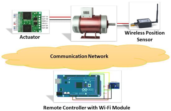 A DC motor system is shown in Figure 3 in a networked environment, where the state-space representation for the DC motor system is given below. The state variable is the armature winding current and is the motor rotational speed. The inputs are armature winding input voltage and load torque , where the physical parameters are in Table 2. The signal chosen for external disturbance is .