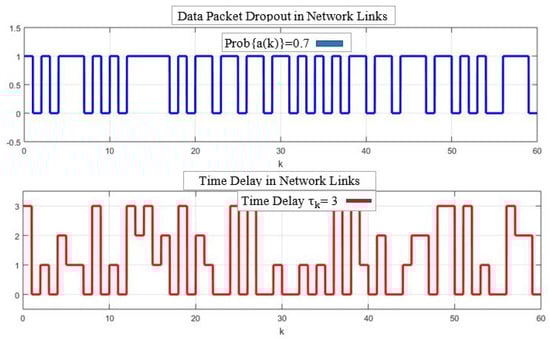 To adequately model the network-induced uncertainties, we model the packet dropout along with time-delay while using complex TPs. We model the packet dropouts with a binary random vector , where denotes the packet dropouts in the communication link. implies that the packet is successfully delivered via the link, and denotes that the packet has dropped out, where i ranges from 1 to m. The following probabilities are assumed for :