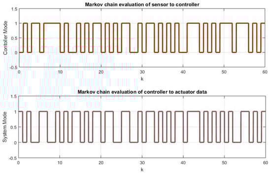 the value denotes that the sensor and actuator are 30 percent faulty, meaning they are working at 70 percent. Probabilities of the stochastic variable for data packet dropouts are given in Figure 4 with the probability . is the maximum time-delay in the network links that are shown in the same Figure 4. The transition probability matrix for the time-delays using the Markov chain is given as