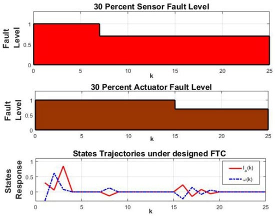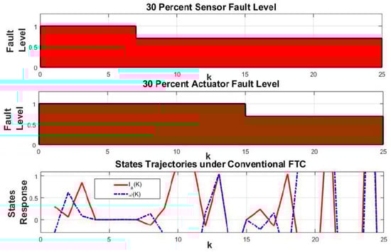 This 30 percent sensor fault is applied at , as shown in Figure 6. The proposed FTC technique successfully tolerates its effects and stabilizes the states. The 70 percent actuator fault is applied at simultaneously with the sensor fault. The states are still stable, even in the presence of simultaneous sensor and actuator faults. To show the applicability of the proposed FTC, we increased the magnitude of sensor and actuator faults up to 70 percent. The proposed FTC tolerates the simultaneous effects of 70 faults, as shown in Figure 7.