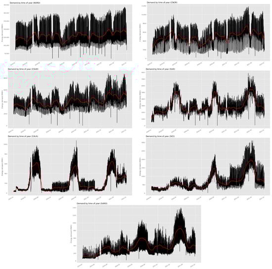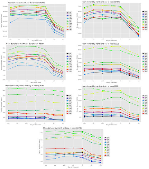 Energy consumption can be affected by several factors, such as, e.g., calendar features. Figure 2 shows a clear time-of-year effect in the data: in NORD, CNOR and CSUD the mean demand is particularly higher in February and July, and lower in April and October; in other words, more energy is needed in winter and summer, whereas fall and spring have a lower demand; we notice a drop in demand in August due to the summer break of many activities. On the other hand, August is the month with the highest demand of the entire year in SUD, CALA, SICI and SARD.