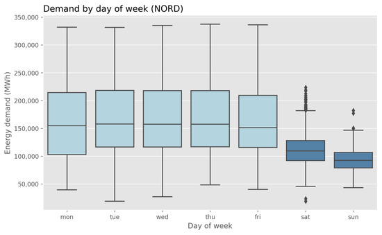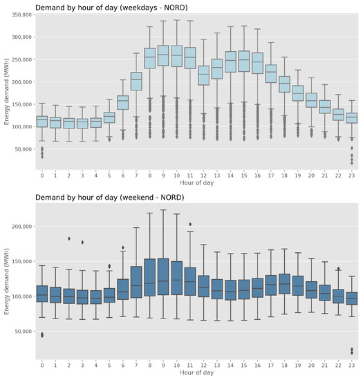 Boxplot of the energy demand by hour of the day for weekdays and weekends in NORD.