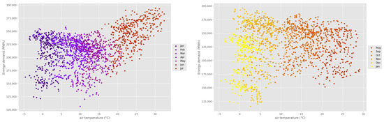 Weather conditions, especially air temperature, are likely to influence the consumption of energy. Figure 6 shows the demand in a representative city in Northern Italy plotted against the air temperature in the city is in agreement with what was found earlier. From January to April, as the air temperature gets warmer, the demand for energy decreases. From April to July, there is a positive correlation: when the temperature is hot, the energy demanded is higher. From September to January, as the temperature gets cooler, energy consumption reduces. Overall, the correlation is non-linear, even though the air temperature is an important factor to consider when predicting energy demand.