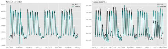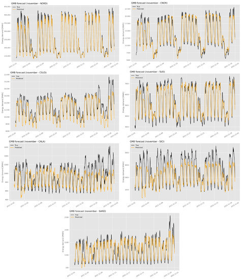 The free and open-source distributed gradient boosting framework LightGBM, originally developed by Microsoft (https://github.com/microsoft/LightGBM, accessed on 6 December 2022), has been imported and used. The code was developed by customizing the library and implementing the training routine as introduced in the previous section. Every day, the hourly 4-day-ahead forecasting of energy demand is produced for every zone. However, only the 1-day-ahead prediction is used for error evaluation once the energy company provides the true energy load consumption for the entire customer’s portfolio (approximately two months after the prediction). The metric used by the energy company to evaluate the performance of the software is the Mean Absolute Percentage Error (MAPE). The reason for using this metric is two-fold: first, it places greater emphasis on penalizing overestimations compared to underestimations, which is desirable as overestimations result in wasted energy and money. Second, the metric of Mean Absolute Percentage Error (MAPE) is the one used by the energy company itself to evaluate the accuracy of predictions. The dataset used for training ranges from January 2019 to October 2021, while November and December 2021 were used for testing. These months have been chosen to assess the behavior of the model both in a normal and regular month, such as November, and in a month with short (8 December) and long (24–31 December) holidays, such as December. The predictions are displayed in Figure 7 and Figure 8.