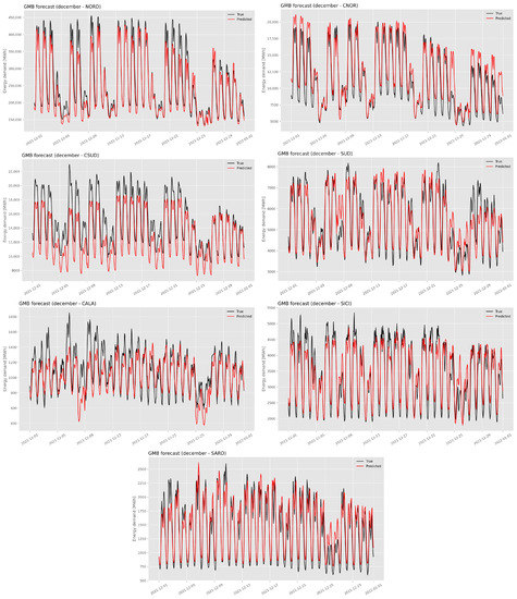 The experimental results show that the GBM model has significantly better performances compared to classical statistical methods, such as ARMA models. The GBM model has been able to learn the multiple inner periodic behaviors, such as seasonal, weekly and daily fluctuations, as well as the influence of weekends and holidays. The MAPE ranges around 10–15%, according to the market zone, but can reach levels of 5% in NORD, where the dataset is bigger. The main drawbacks of the model are that it systematically underestimates performance, which is caused by both the error metric used and changes in the customer’s portfolio, and it struggles to accurately predict high and low peaks. To address the first issue, future research should focus on analyzing the magnitude of the underestimation over time for each region. The second issue will be further investigated by studying the factors that most impact predictions during peak hours, which will be carried out in future work.