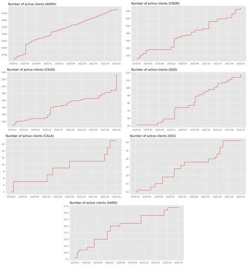 The main innovation in this work is that predictions are made without using the most recent data, which requires additional effort to tailor the model to the available ones. Specifically, on the first day of each month, the most recent data is two months old. The problem has a technological nature: newer versions of electric meters send the measurement every 15 min, whereas older versions send it every hour, day, week, etc. Moreover, the number of clients can change over time, as new contracts are activated and existing ones may terminate. To compensate for this, the company delivers daily files containing the most recent available (partial) information: past consumption and state of the contracts of clients, forecast of the air temperature. Further details are provided in Section 3.1.