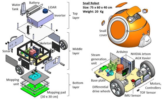The exploded view and subassembly CAD model of the steam mopping robot, showing the structure and indicating the key components, is shown in Figure 2. The robot’s overall size is 75 × 60 × 40 cm, and the total weight is 20 kg. The main assembly of the robot is segmented into three layers: bottom, middle, and top. Here, the bottom layer is the mopping unit assembly. The middle layer is a ruggedized skeleton made of a 3 mm aluminum base plate and extruded profiles where the wheels, motors, controllers, sensors, and steam generation units are assembled. The top layer carries a battery, inverter, LiDAR sensor, and water tank. The robot locomotion was designed with a differential drive mechanism, and it uses wheels 150 mm in diameter made of solid rubber with an aluminum die-casted rim and two supporting caster wheels. Two 24 volt brushless DC geared motors with 1.9 N-m of torque were used to power the wheels separately with a closed-loop control function. For proper navigation of the robot, an inertial measurement unit (IMU) and time of flight (TOF) sensors were fastened to the middle layer base plate of the robot. Here, the IMU is placed at the center portion of the two-wheel axis, and the TOF sensors are placed facing toward the ground. Furthermore, the electronic components include an NVIDIA Jetson AGX Xavier onboard processor, Arduino microcontroller, and voltage regulators, which are also mounted to the middle layer. Two waterproof sonars are mounted on both sides of the robot cover toward the rear. The slit designed in the snail cover enables LiDAR coverage of 210°. Furthermore, the lids of the robot cover allow easy access to the water tank and electronics control. The outer Snail shape’s protective cover was 3D printed using ABS resin, and it can be easily removed to replace the mop. Here, the overall size of the robot is bulky compared with domestically used mopping robots, mainly due to the higher-capacity battery and inverter required for a tetherless steam-generating system. In addition, the outlook shape we designed as a snail took up more space. Here, we opted for a snail outlook because the robot prefers to run slower, allowing sufficient exposure per unit area (mopping pad size) for adequate disinfection. Additionally, it temporarily leaves a water trail mark while traveling, resembling a snail. This size and outlook will help highlight the robot’s presence in a large, crowded workplace, avoiding accidents and being aesthetically pleasing. The mechanical design of the cleaning payload is detailed below.