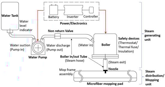 The steam generation unit is designed to provide continuous steam of 100 C at the mop–floor interface for effective disinfection. A lower power of 1300 W and two bar absolute pressure-rated compact boiler were selected to balance energy consumption and meet the disinfection temperature requirements. The boiler system also includes a thermostat, thermal fuse, and an insulated casing for safety. A 0.5 L water tank, 30 mL/min discharge-rated peristaltic water pump, and a non-return valve were used to regulate the water supply using silicon rubber tubes. The boiler and pump operations, including the water level, are controlled by an Arduino mega microcontroller. The water level sensor will trigger an alarm once the water level falls below 20% of the tank capacity. A 24 V, 40 Ah Li-ion rechargeable battery is used to power the heater unit, which is capable of discharging 1300 W of power using a 2000 W inverter. The same battery was used for powering the rest of the other systems. The steam generation and distribution process flow diagram is shown in Figure 3.