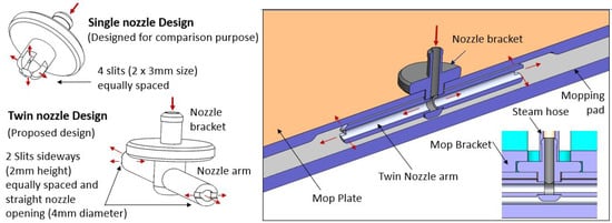 A microfiber material is used for the mopping pad, with a designed size of 30 × 30 cm. The microfiber material has high heat retention [36,37] and durability. The mopping pad was connected with the boiler unit using a synthetic braid flexible butyl rubber hose capable of holding around 6 bar of steam pressure and a temperature of around 165 C. Furthermore, a twin-nozzle module was designed with two separate arms and a heat-resistant nylon material nozzle bracket for effective steam dissipation. The two arms of the nozzle are joined with a nozzle bracket sandwiched between a mop bracket and a mop plate. The mop bracket, plate, and frame were fabricated using heat-resistant polypropylene material. The proposed twin-nozzle design is shown in Figure 4.