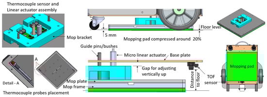 The mopping unit is equipped with a steam temperature-sensing system to assure a uniform disinfection temperature of 100 C at the mop. Two thermocouple sensors, sensing a range of 600 C, were used to monitor the steam temperature. The sensors are housed in the mop bracket, and the probes are mounted at the two diagonal corners of the mop plate toward the mop. This helps with monitoring the target steam dissipation temperature across the mop. The sensors are connected to an Arduino UNO microcontroller. Furthermore, an auto-adjustable mop–floor contact-sensing system is integrated to maintain the mop’s pressure with various floors, uneven surfaces, or any tiny floor material. Figure 5 depicts these two systems. In addition, a TOF sensor (range: 4–30 cm), mounted at the base plate and facing the floor, reads and stores the distance to the particular floor once the initial mop–floor contact set-up is complete. Furthermore, suppose there is any change in this initial TOF sensor reading due to an uneven surface or ground material. In this case, a micro linear actuator with feedback will trigger to auto-adjust the mop level. This linear actuator (22 N and 30 mm stroke) is mounted with a base plate and mopping unit. A roboclaw motor controller is used to update the actuator motion with the Arduino UNO microcontroller. The whole mechanism helps to adjust the mopping unit height up to 9 mm, aided with guide bushes and pins.