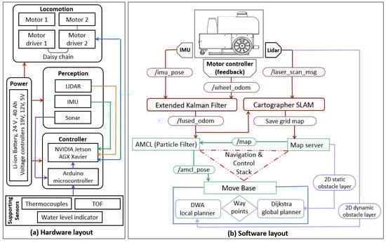 The Robot Operating System (ROS) melodic framework was used to build the software modules and also act as the middleware to support and establish communication between other hardware units and software packages. The navigation stack and control system stack of the robot were build on top of ROS. The higher-level systems such as the 2D LIDAR, IMU, and motor controllers are directly connected through SBC using ROS nodes, which publish the sensor data in their corresponding ROS topics to support the navigation stack and control stack. The ROS Navigation Stack was adopted to implement the autonomous navigation, which subscribes the motor controller feedback, IMU feedback, and fusion with an extended Kalman fiter (EKF) to estimate the odometry data and uses an adaptive Monte Carlo localization (AMCL) package for the robot’s localization. A move base package plans the path (global planner) and avoids the obstacles present on the map, and a local planner controls the robot to avoid dynamic obstacles by aligning the robot’s motion with the generated global path. The Cartographer SLAM algorithm was used to generate a 2D occupancy grid map of the environment and for autonomous navigation. The control system stack manages the navigation goal and executes the trajectory algorithm to continuously monitor the state of the robot from the high-level sensor and lower-level sensors connected to the robot. Based on the feedback from the sensors, the control system stack fine-tunes the robot trajectory.