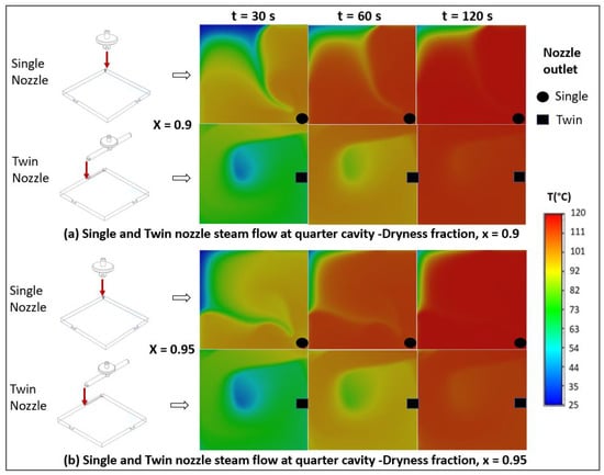 Figure 8 shows the steam dissipation at different time instants for the two steam qualities and the two nozzle designs. For each plot, the top left area corresponds with the corner. The bottom right area corresponds with the nozzle’s location in the single nozzle case. In the twin nozzle case, the nozzle inlet was positioned at almost half the distance from the bottom right to the top right corner. With the twin nozzle set-up, a temperature of around 100 C was reached at the corner after 120 s for both steam qualities, which was not the case for the single nozzle.