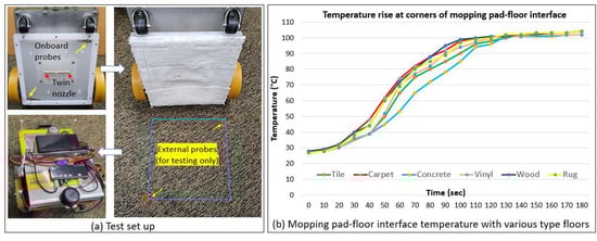 A steam dissipation real-time test was conducted to assure uniform steam dissipation across the mopping pad–floor interface meeting the disinfection temperature. Here, the onboard thermocouple sensors monitor the steam temperature at the inner side of the moping pad. Hence, two additional thermocouple sensors were mounted diagonally on the floor (matching the pad’s corners) to measure the steam temperature at the pad–floor interface in the extreme corners. The test was conducted on tile, carpet, concrete, vinyl, wood, and rug floors at room temperature (around 25 C). Figure 9 shows the test set-up for the carpet floor. Accordingly, on the carpet, rug, and wooden floors, the steam temperature reached 100 C within 115–125 s, whereas for the vinyl, tile, and concrete floors, this took 125–135 s. The onboard sensors read the maximum temperature of 105 C at the this longest time period of 135 s. Hence, the target steam temperature for the onboard sensors was fixed at 105 C for both the initial set-up and while mopping.