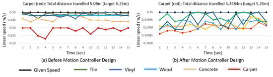 To validate the motion controller performance, traverse speed feedback, and how closely the robot followed the given trajectory, tests were conducted before and after motion controller execution. The tests were conducted on tile, carpet, concrete, vinyl, and wooden floors at different linear and angular speeds (0.02–0.4 m/s and 0.2–1.0 rad/s, respectively). The tests were conducted at room temperature (25 C) while assuring that the onboard thermocouple sensors and linear actuator mechanism were working correctly to maintain the steam disinfection temperature and constant mop contact with the floor before starting each test. In the robot’s traverse feedback test, the actual velocities of the robot for each motion were recorded from the motor controller feedback and compared with the given velocity at every second. Accordingly, without a motion controller, there was obvious lagging, especially while driving through rough carpets, due to friction and wheel slippage. Figure 10 shows the traverse feedback test conducted at a linear speed of 0.35 m/s for 15 s before and after implementing the motion controller design. For the carpet, the actual velocity dropped to 0.335 m/s most of the time, which was improved to be very close (0.349 m/s) to the given velocity before and after the motion controller design, respectively.