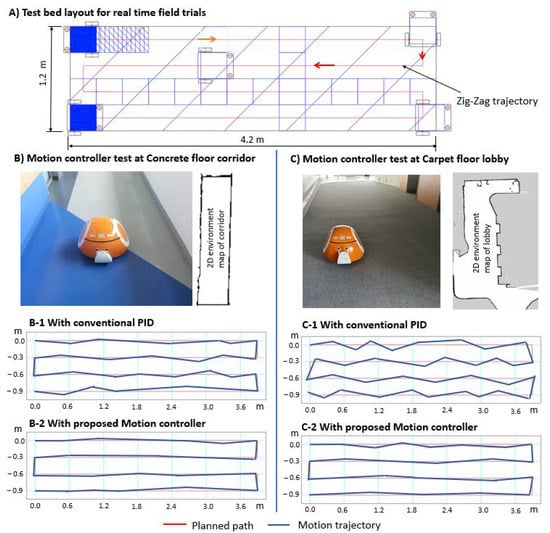 Furthermore, consistent lane tracking to avoid any deviation from the given path was tested on the same types of floors. A test bed size of a 1.2 × 4.2 m area was selected, and a 2D map of this test bed environment was generated using Cartographer SLAM to follow the planned path in a zig-zagging pattern using the waypoint coordinates of the map. Figure 11 shows this test bed’s details together with the test results for a smooth concrete floor and rough carpet (the two extreme conditions) with and without executing the proposed motion controller (i.e., comparing the basic PID controller with this friction-estimated improved motion controller design). The motion controller comparison results are plotted in the same figure (B-1, B-2, C-1, and C-2), showing the performance improvement following the given trajectory with the motion controller design. The plotted trajectory was based on linear and angular speeds of 0.3 m/s and 0.2 rad/s, respectively, and we found similar changes at other speeds.