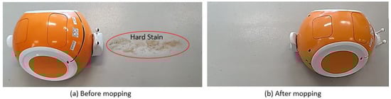 This section details the cleaning efficiency test of the steam mopping robot compared with a normal mopping robot by replacing the boiler-nozzle assembly of the Snail robot with a normal water-spraying unit. We mainly tested removing a hard stain and the wet floor drying time on a concrete floor. We tested removing two similar hard, stubborn stains: one with steam and the other with the normal water mopping robot at the same speed. The steam mopping robot needed two iterations, while the water mopping robot needed four rounds to completely remove the stain, as shown in Figure 12. Similarly, it was observed that after the Snail robot’s steam mopping, the wet surface dried within 1.5 min, whereas for the manual mopping with water, it took around six minutes for the surface to dry. Here, the superheated state of the condensed water helped to clean the hard stain and dry the floor quickly for the steam mopping robot. In addition, the steam mopping robot consumed 1 L. of water to mop a 5 m area, whereas normal water mopping took around 3.5 L for the tested concrete floor. This shows that the steam mopping robot assured a green and hygienic environment, avoiding chemicals and killing harmful germs and bacteria while being less expensive, avoiding big water tanks, and being more productive for the cleaning industry.