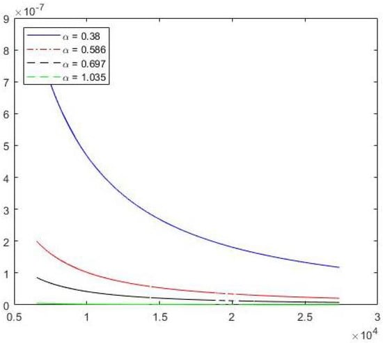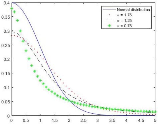 as . To calculate the entropy, we used to estimate  from different values of  for some daily data markets from 1990–2019. Our study focused on Dow Jones industrial average index (DJIA), , and  (TASI) Tadawul all-share index. Moreover, calculate the entropy of the exchange rate data, we used to estimate  from different values of  for GBP/USD, USD/SAR, and USD/JYP from 2000–2022. This was achieved by using the diffusion entropy analysis (DE) [] and on developing an R code for this method. Figure 3 depicts the tails behavior of the characteristic Lévy stable (4) (with  and ) for the  daily data, where  it was taken from Table 1 ( =  and ). We observed that the tails are heavier in increase when  decreases.