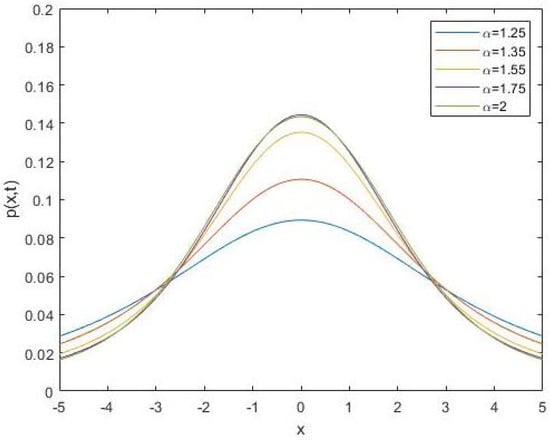 Comparing the tail behavior of Brownian motion of () and Lévy stable of Equation (4) at varying value of , with  and . It can be observed that the tails get heavier when  decreases.