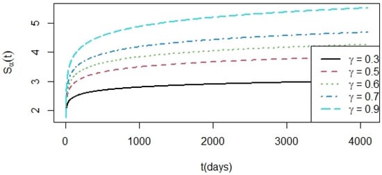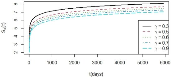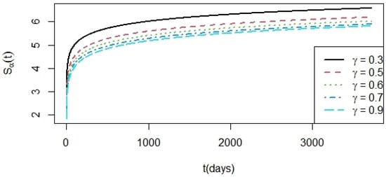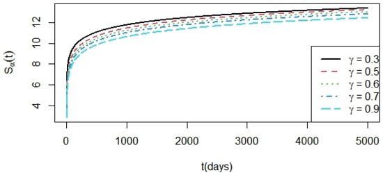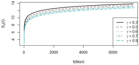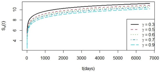 Figure 4, Figure 5 and Figure 6 refer to the calculation of the entropy analysis for different values of gamma from different stock markets (DJIA, , and TASI). We demonstrate that the scaling behavior of different indices is almost the same, with the gamma values in the interval (0,1). Figure 4 presents the results for entropy analysis of (34) and the solution (37) at a series of times for the DJIA, which show the values of  =  and  for five different values of  ( = 0.3, 0.5, 0.6, 0.7, and 0.9, respectively). Based on , there is a distinct monotonic relationship where the entropy increases when  decreases.