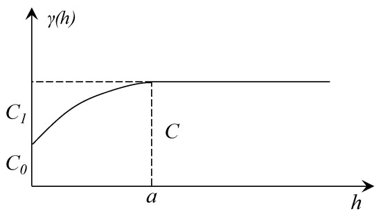 On the basis of the solved distance of samples and semivariance, the variation function of the variation curve can be fitted, which reflects the relationship between the value of the variation function and the certain lag distance h. In Figure 3, is the ‘nugget’ of , which means the monitoring errors and the short distance are unknown or constitute random spatial variation. is the block gold effect, which indicates the fluctuation of the variables between two points when h is very small. a is the variation range. When , the correlation of the variable values between any two points decreases as h becomes larger. In addition, when , the correlation no longer appears. a reflects the range of influence. is the total abutment value, which reflects the intensity of the variation of a regionalized variable in the study area. When , the value of can be calculated as follows: