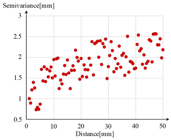 The locations of the monitoring points in PL systems were selected as the locations of the sampling points. According to the results of the finite element numerical simulation, the basic deformation field of the arch dam can be calculated so that the basic deformation values of the monitoring points can be obtained: . On this basis, can be calculated by using the Monte Carlo stochastic FEM. Consequently, according to Equation (33), can be calculated. For one of the generated sample deformation fields, the distribution of the sample distance and semivariance of 100 samples of are shown in Figure 8.