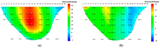 Once the variation function model has been established, the weight coefficients can be calculated according to the kriging equation in Equation (41), and at the unmonitored points are estimated from the known values of at the monitoring points. After obtaining the basic deformation values at the unmonitored points from the FEM simulation results, the estimated values of at the unmonitored points can be solved according to Equation (31). The estimated values of the deformation at the unmonitored points can be estimated on the basis of the estimated values of and at the unmonitored points and according to the deformation of other known points.