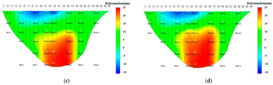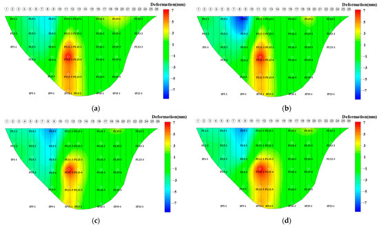 The estimation results of radial arch dam deformation fields, based on (a) the FEM; (b) the proposed method; (c) the ordinary kriging interpolation method; (d) the universal kriging interpolation method.