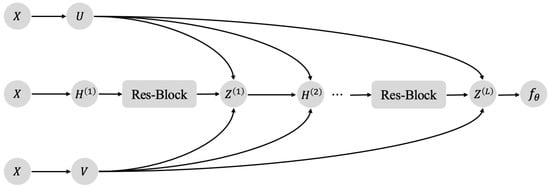 More specifically, and are the input and output of the ResNet block, respectively. F is an operation consisting of a fully connected layer and activation function, which could be defined as here, with input X, hidden layers’ parameters and an activation function . As for the element-wise addition , it could be conducted by a shortcut connection. The effectiveness of such a block in PINNs was demonstrated in [11] and here we used it as a feature enhanced sub-structure of our network. The features could be fused by a shortcut connection and fed into updating the hidden layers by an element-wise multiplication operation with U and V, as shown in Figure 3. Compared to simple fully connected neural networks, our architecture enhanced the representative ability of hidden layers by ResNet blocks, which could make it easier for the network to learn the desired solution. Meanwhile, embedding of inputs from low-level space to higher dimensional feature space could also be considered here, and could be fused, using the attention mechanism during the forward process.