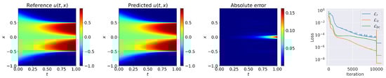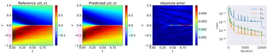 - Mean squared loss on the boundary conditionwhere is the prediction of neural network and we sampled = 25,600 residual points, boundary points and points on the initial condition. Here, we used the Adam optimizer with 10,000 epochs and L-BFGS optimizer with 1000 epochs to optimize the network architecture. During the training process, we set the boundary weight and the initial weight , which could help expedite the convergence. Figure 4 shows the numerical results of constrained self-adaptive PINNs(cSPINNs) compared with the reference solution obtained through the Chebfun method [29] and the training loss history. The relative error was 1.472 × 10, which was better than the time-adaptive approach in [7] and the original PINNs [1].