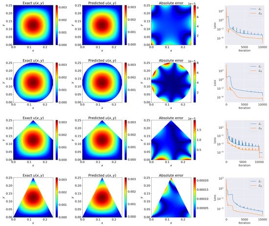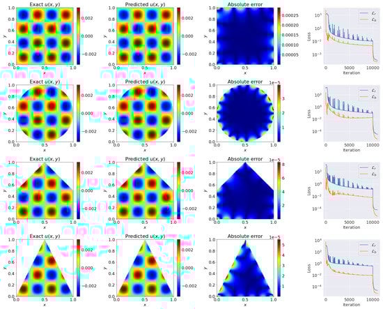In this case, we first tested the performance of cSPINNs on a rectangular domain . We sampled = 10,000 residual points in the inner domain and = 1000 boundary points distributed on the boundary area. The ResNet block-enhanced modified network was trained with 10,000 epochs Adam and 1000 epochs L-BFGS. Meanwhile, different geometries, including circular, triangular, and pentagonal domains, were also tested to demonstrate the advantages of cSPINNs. The error between the predicted solution and the reference solution on different geometries is shown in Table 1. It is worth noting that we magnified the loss value by a constant number of c = 10,000, due to the relatively small true value (the maximum value of exact solution was about 0.003) in the solution, to ensure normal gradient backward during training. As for an irregular domain, we sampled the same number of points as for the rectangular domain. We found that the cSPINNs achieved good performance in this problem, as shown in Figure 7. The original PINNs failed, as shown in Figure 1.