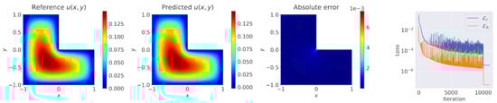We tested the performance of cSPINN on the L-shaped domain and show the results in Figure 9. The maximum point-wise error was yielded at about 6 × 10 and the relative error 4.257 × 10. In [30], PINNs achieved accurate results with about 0.02 maximum point-wise error in the same case on the L-shaped domain. In [31], hp-VPINNs also tested the performance and, in this case, achieved about 0.02 maximum point-wise error on the domain. Therefore, cSPINNs also performed well, even on such concave geometry.