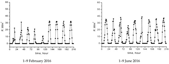 For any statistical analysis, an important aspect is the collection and sampling of the data. In this paper the data are collected from a photovoltaic power plant located in the southeastern part of Romania during the 1 January 2016–31 December 2016 period. The sampled data contain the specific power values for every hour in the given period and these data were used to develop the model. Half of the data accounts for the zero value since the solar irradiance was negligible for 12 h in a day and this is highlighted in the graphs in Figure 1. Hence, the considered time series formed by the hourly data were discontinuous and a new continuous time series was constructed involving the average daily specific power and this was used to predict the average specific power.