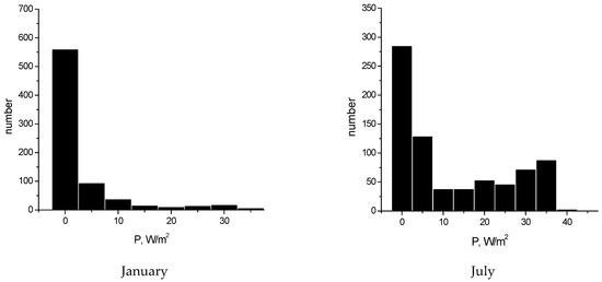 The variation of the circadian cycle overlapped as expected by the variations of the meteorological factors. As a result, the data have a high degree of fluctuation. The same behavior is evidenced by the histograms in Figure 2.