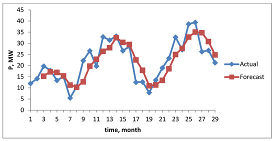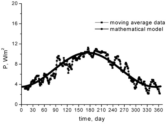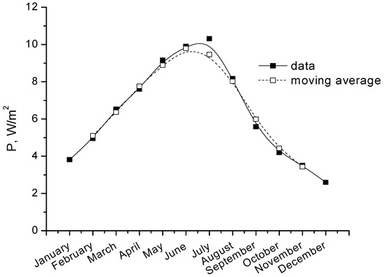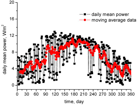 Since the collected data form a discontinuous time series, the general properties and procedures cannot be directly applied. For this reason, the moving average (with n = 6) has been used to smooth the data of the analyzed time series in order to obtain mathematical models in good agreement with the experimental data. Since the fluctuations are rather large, many values for n have been tested to obtain the best data smoothing. The value n = 6 was considered the smallest values which could confer the needed smoothness to the time series, and it was sufficiently high to maintain the trend. The time series constructed in this manner are continuous. Prediction models have been developed for the specific power of the next day, next week, and next month. The monthly model was the most accurate, taking into account the superposition of the graphs from Figure 8 and the value of the coefficient of determination. It was proven that the data formed a stationary time series with seasonality by using the CUSUM method.