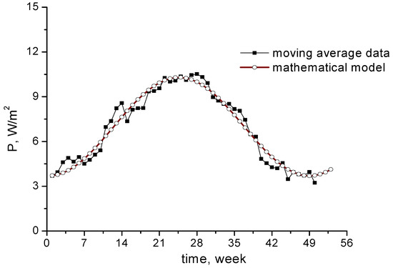 In the following figure, the weekly means of the given data (collected hourly) together with the moving averages of these means were compared. Once again, the seasonality of the moving average data was revealed; at the left and right extremes of the following graph, the small values corresponded to the winter weeks, and larges values were observed in the middle for the summer weeks.