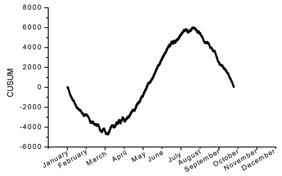 To support this assertion, the CUSUM chart of these data was built since this chart is very sensitive to the trends of the data (Figure 11). The analysis of this chart showed seasonal trend changes. These changes occurred in the months with the highest meteorological instability in the region, namely in April and November, while August is a month of maximal meteorological stability in Romania. At the same time, the small fluctuations of the trend suggest that they may vary with the circadian cycle, either weekly or monthly. In other words, the time scale at which the model is formulated may influence its quality.