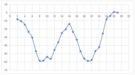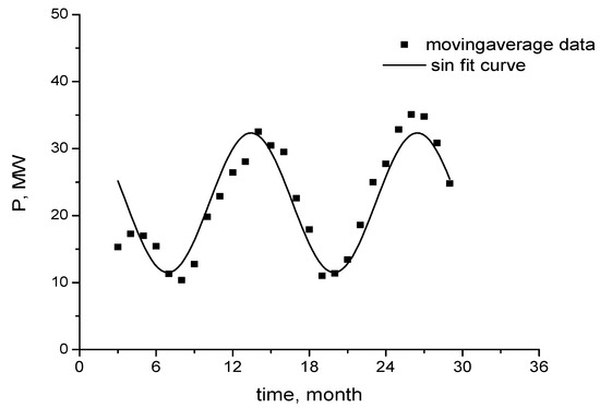 The value n = 6 seemed to be optimal for smoothing the data over the entire year. The above graph highlights the fact that the smallest production values were in winter, i.e., at the beginning and at the end of the time interval considered, while the highest amount of power was obtained in summer, in the middle of the data period.