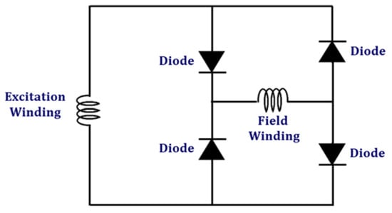 Similarly, the rotor also consists of two different windings named two-pole excitation winding (E-Winding) and four-pole field winding (F-Winding). The 2P-winding of the armature induces a harmonic current in the two-pole excitation winding of the rotor. This excitation winding is further connected with four-pole field winding with the help of a full bridge rectifier to supply the DC current for the brushless operation, and the rotor winding configuration is shown in Figure 1c. The interaction of this rotor field with the main armature field produces the torque of the motor. Further, rotor circuit connections through a bridge rectifier are shown in Figure 2.