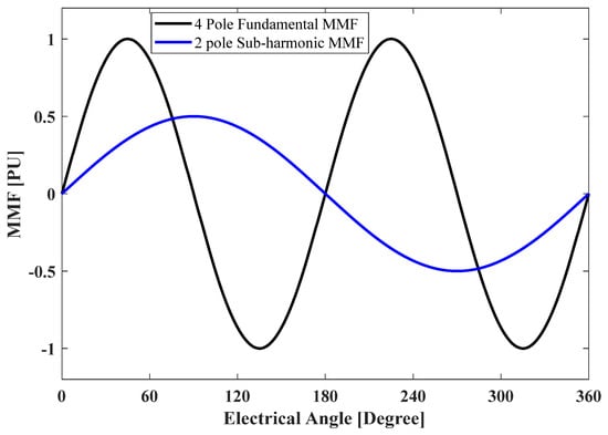 To confirm the generation of subharmonic for the proposed topology using additional single phase 2P-winding, the MMF is drawn and analyzed on the same input current as in reference machine. The resultant MMF waveform is given in Figure 6a, and its harmonic contents are shown in Figure 6b, which reveals that the magnitude of subharmonic component is 80% of fundamental one. It can be noted that the MMF for the proposed machine is rich in the subharmonic component; however, the magnitude of the fundament component is reduced by almost 15% as compared to that of reference machine. It means the proposed machine will provide better induction via subharmonic component than the reference machine. However, due to lower fundamental component, it will require more field current to generate same torque as in the reference machine. The waveforms of these fundamental and subharmonic components will be the same as of reference machine shown in Figure 4, except for their magnitudes.
